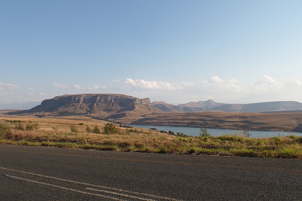Als we hierna nog kort vanaf een uitzichtpunt over het meer uitkijken rijden we door en zijn rond half vijf bij de Montusi Mountain Lodge, aan de voet van de Drakensbergen.