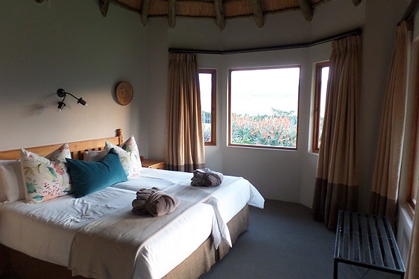 We zijn terecht gekomen in een paradijs. Een prachtig aangelegde lodge waar we een bungalowtje krijgen met uitzicht op de Drakensbergen. Het huisje zelf is voorzien van alle gemakken en het is een genot om op je eigen terrasje te zitten en naar de omgeving en het drukke vogelleven in de bloeiende struiken te kijken. We zijn best wel moe en nemen allebei eerst een lekkere warme douche. Hierna lopen we naar het restaurant waarbij het wel even wennen is dat het hier om 6 uur 's-avonds volledig donker is. Het is rustig in de lodge en ook bij het diner zijn slechts 3 tafeltjes bezet. Als we hierna terugwandelen besluiten we om nog wat te drinken en dan het bed op te zoeken. Om half 10 liggen we er in.