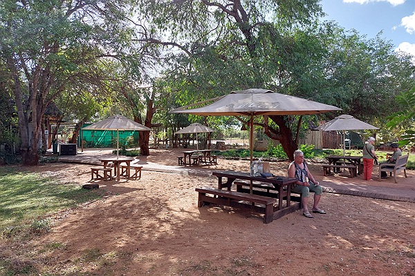 De hele route vanochtend hebben we slechte tot zeer slechte wegen gehad met gaten, hobbels en stenen. We zien wel ontzettend veel dieren en het leuke is, als we stoppen om een foto te maken van een roofvogel in een boom veroorzaken we een ware file. Wij stoppen, de auto achter ons doet dat ook, net als een derde auto en dat wekt nieuwsgierigheid bij diverse tegenliggers die willen weten waarom de auto's gestopt zijn.