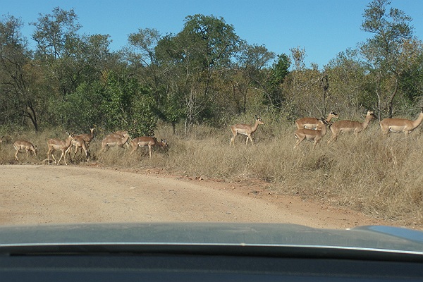 Een grote kudde impala's zorgt voor leuk oponthoud.