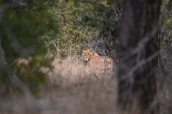 Als we een tijdje over de H5 rijden ziet Ans dat vlak voor de auto van een tegenligger in de verte een groter dier de weg oversteekt. Niet veel later stoppen we naast hen en door de geopende raampjes vertellen zij dat er leeuwen overstaken die in het struikgewas verdwenen zijn. De beesten hebben zich daarna niet meer laten zien. Natuurlijk speuren wij de struiken af en ja hoor, wij zien ze wel. Leeuwen. Mooie foto's maken is moeilijk maar ze hebben kunnen zien is ook al geweldig.