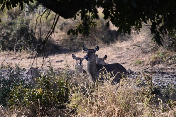 Waterbokken houden de leeuwin angstvallig in de gaten.
