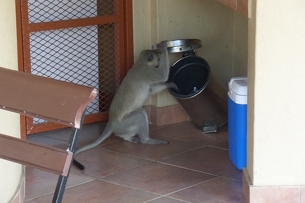 Om morgen op tijd te kunnen vertrekken maakt Ans even later, buiten aan het tafeltje, vast brood klaar voor de volgende dag. Maar, als ze zich even omdraait naar het aanrecht stelen apen de al klaargemaakte boterhammen. Ook de vogels zijn heel brutaal en zitten zowat op je tafel.